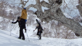 澄んだ空気の中、神奈山麓に広がる素晴らしいブナ林へ。誰もいない山のいい雪だけを満喫しに行くツアーです。そのためには深雪が滑れる技術と早起きが必要です。積雪状況にもよりますが冷えた空気の中を2時間ほど登りノートラックを体力と時間の許す限り何本も滑ります。滑り手の欲求を叶えるとてもシンプルなツアーです。